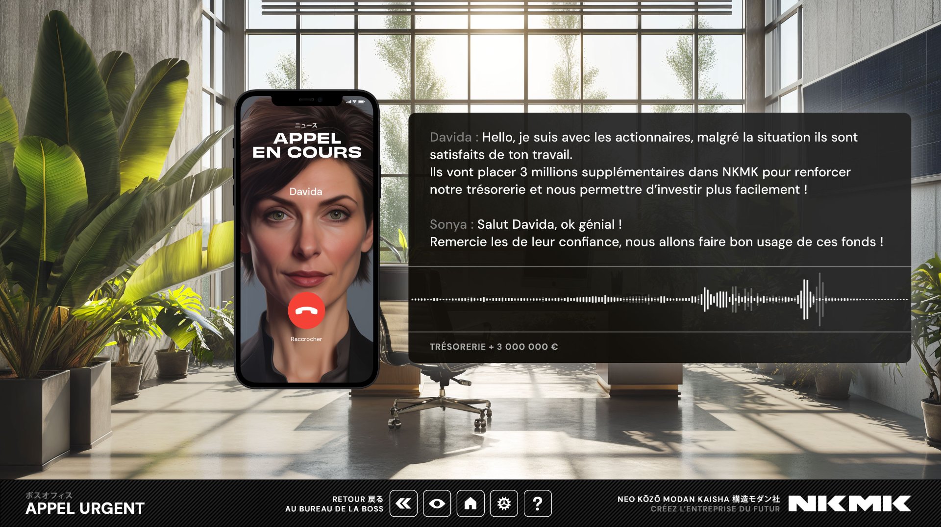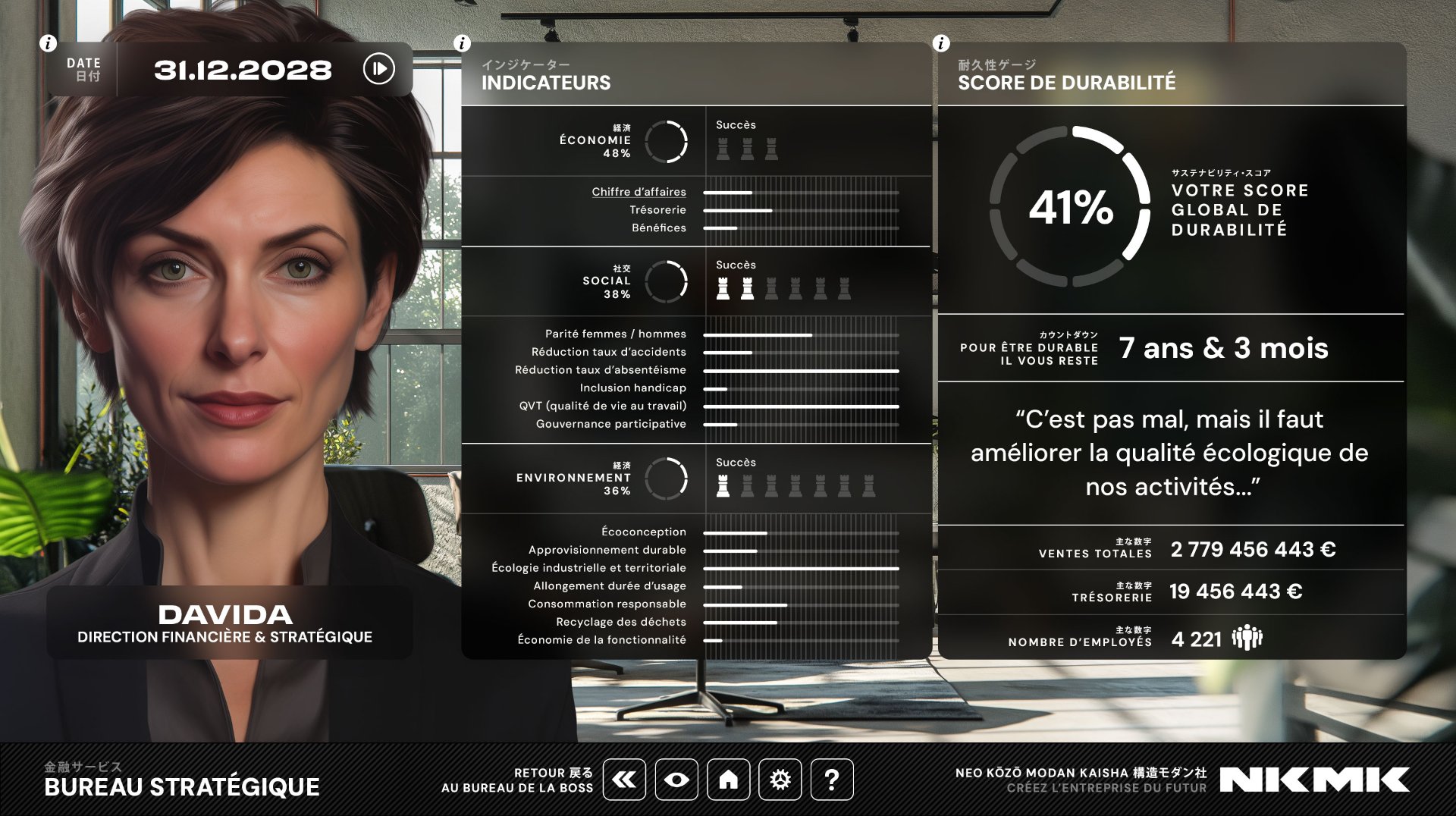 NKMK (Neo Kōzō Modan Kaisha) est le nom de l’entreprise fictive que les joueurs dirigent. Ce nom volontairement hybride s’inspire du japonais afin d’évoquer un univers familier aux collégiens (mangas, jeux vidéo, culture urbaine), tout en introduisant une prise de distance critique vis-à-vis de nos modèles économiques.