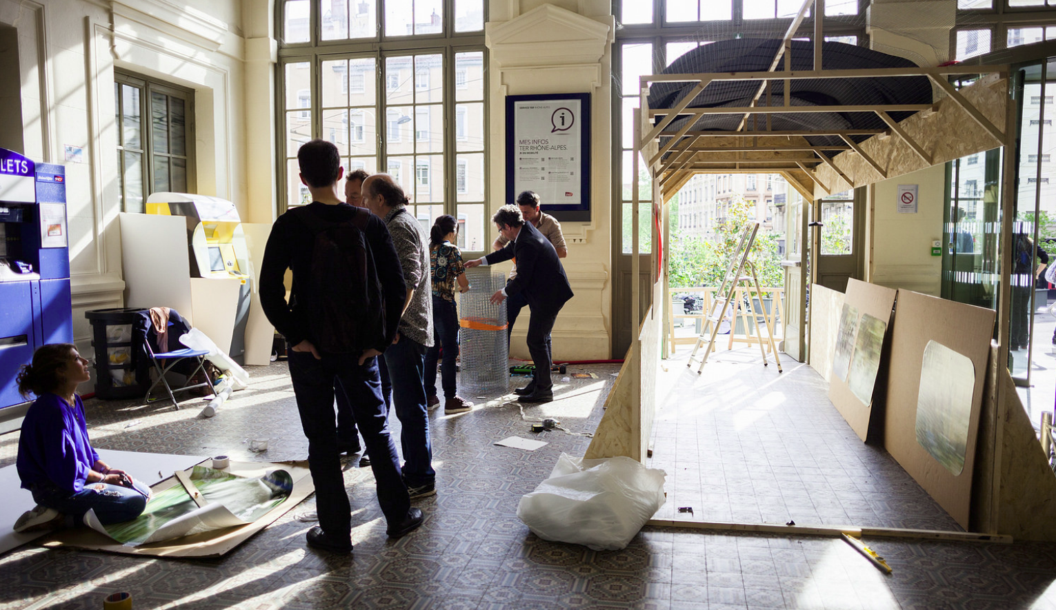 – une base arrière de ressources et matériel permettant la mise en œuvre et les itérations de production : impression/dessin, fabrication/cartonnage, projection/audiovisuel, assemblage/structure, calage, dispositifs numériques actifs avec leurs frameworks... mais aussi une bibliothèque de savoirs, de charte et d’histoire du lieu (livres, kits pratiques, wikis...)