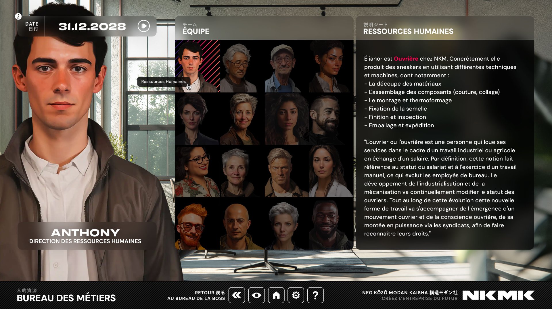 NKMK est un jeu de gestion et de décision. Les joueurs incarnent Sonya la dirigeante d’une entreprise fictive de sneakers et doivent prendre une série de décisions stratégiques ayant des conséquences économiques, sociales et environnementales : choix de matériaux, organisation de la production, formation des équipes, réaction à des crises, conception de nouveaux modèles, etc.